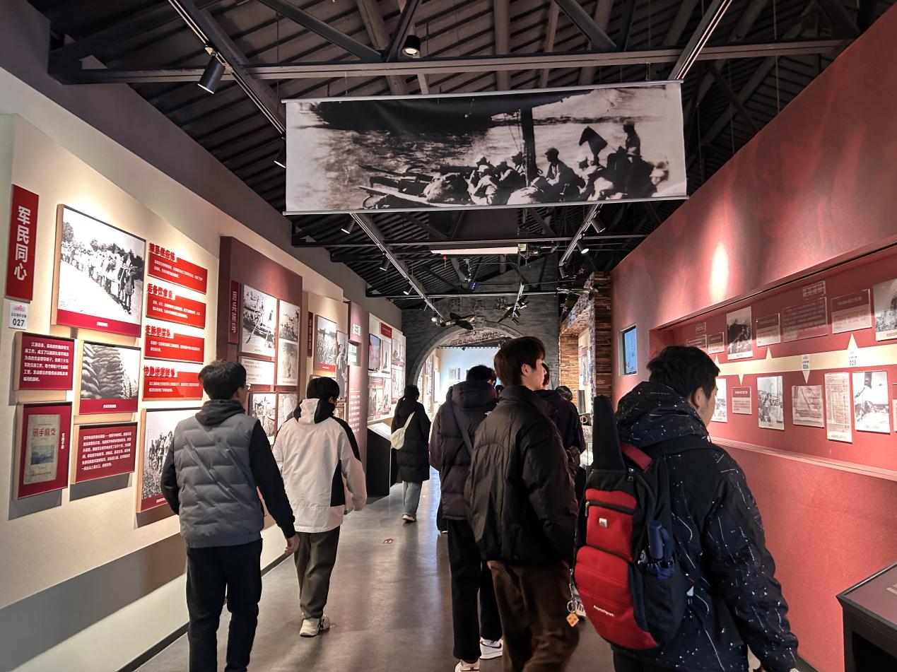 三浦战役是解放战争时期渡江战役的前哨战,在南京解放进程中具有重要意义。史料馆内,一幅幅珍贵的历史图片、一件件厚重的实物展品、一段段生动的影像资料,以“枕戈待渡,决胜千里”“渡江序幕,鏖战三浦”“大江飞渡,红旗飘扬”“胜利足迹,继往开来”四大篇章为脉络,系统呈现了这场战役从战略谋划、浴血鏖战到胜利告捷、精神传承的完整历程。同学们循着篇章脉络有序参观,在沉浸式学习中深入掌握了战役的时代背景、战斗经过与深远历史价值。