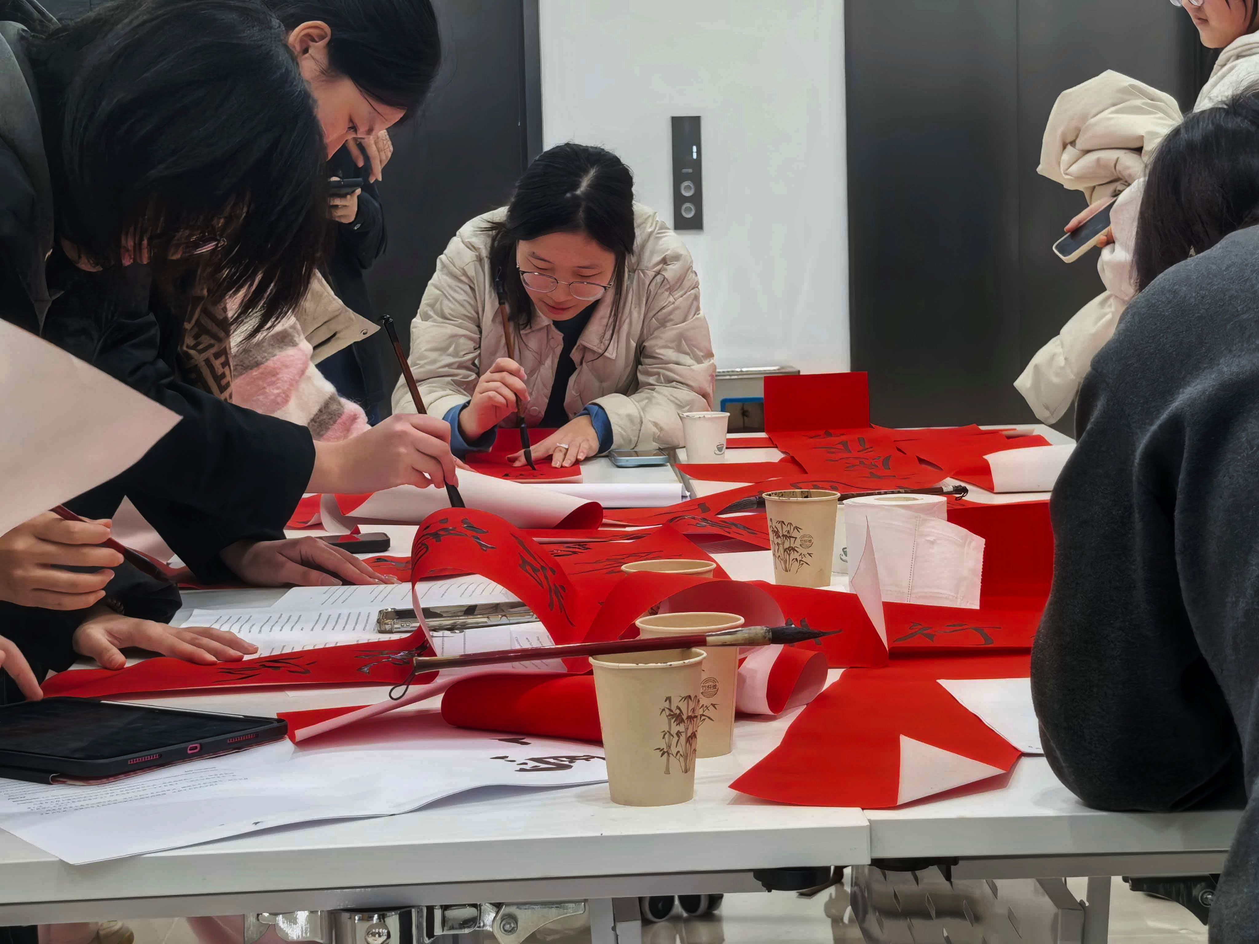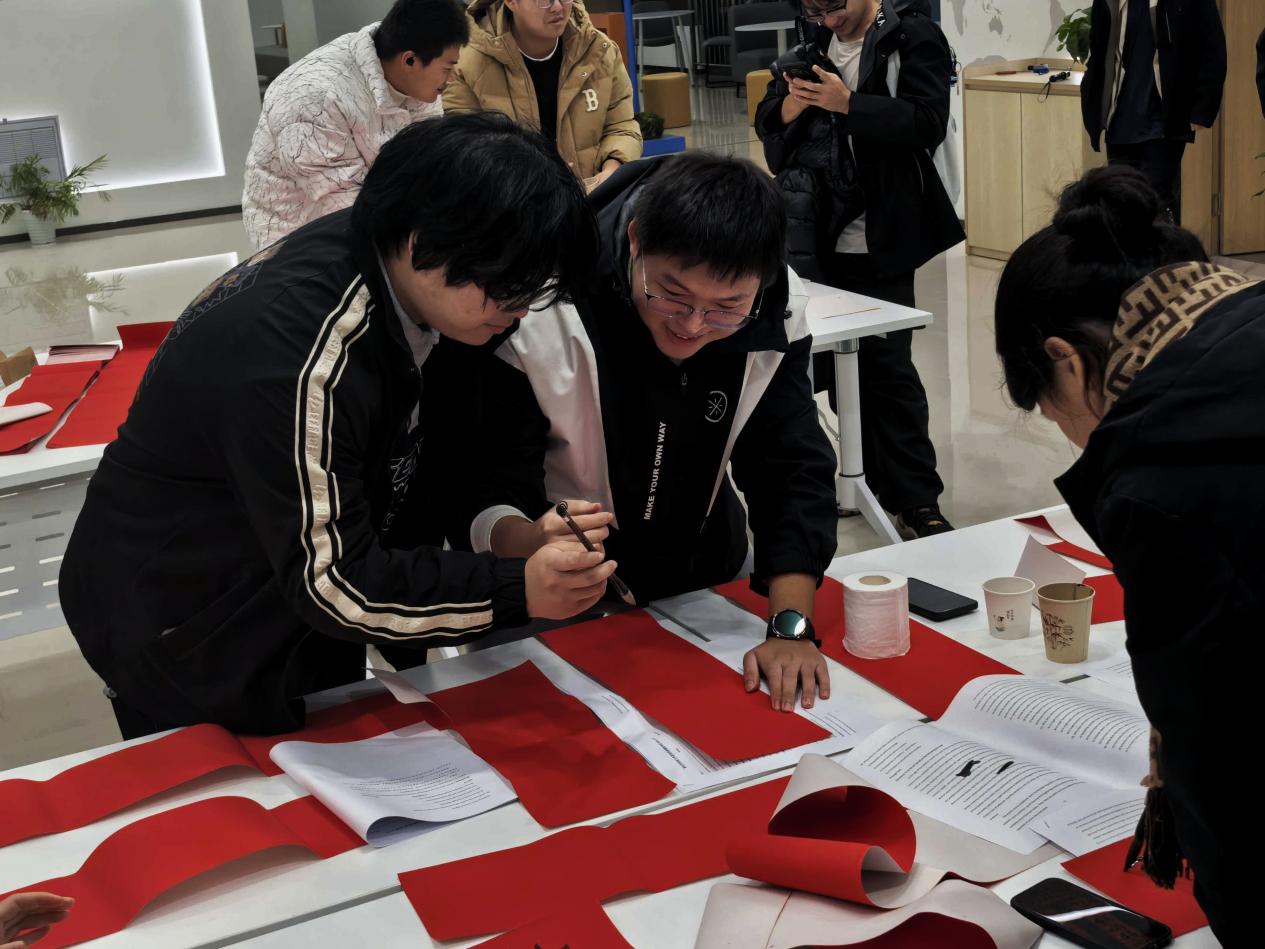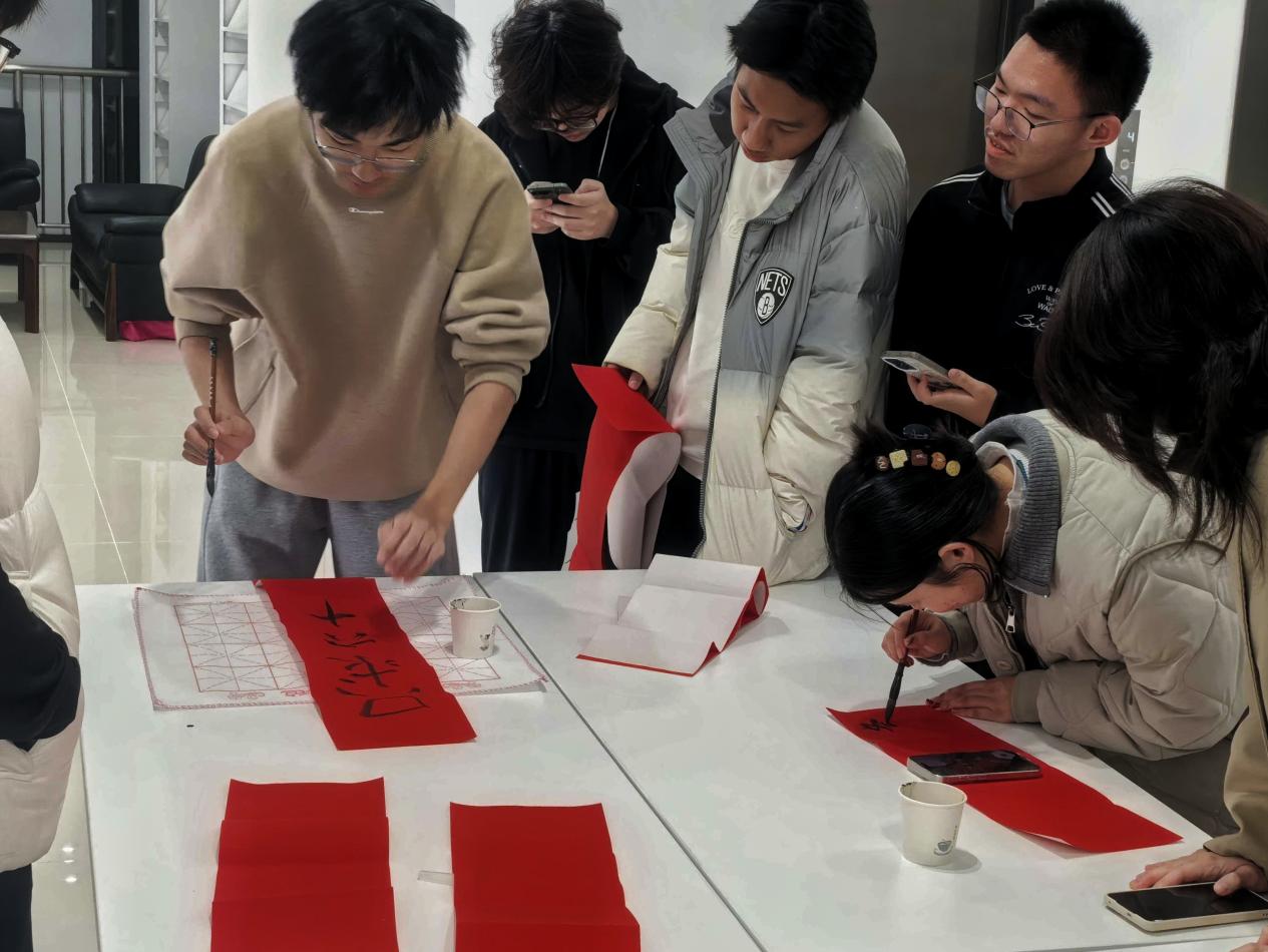 活动在专注而温馨的氛围中持续近两小时,大家不仅完成了各具特色的春联作品,更在笔墨交会间自然交流、互相启发。同学们纷纷表示,执笔书写的过程让人沉静,在点画转折中切身感受到汉字的结构之美与笔墨意趣,而一幅幅亲手写就的红纸黑字,更承载着对新年真切而个性化的祝愿。